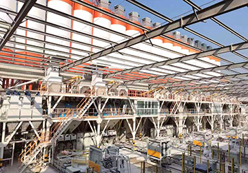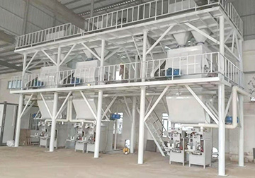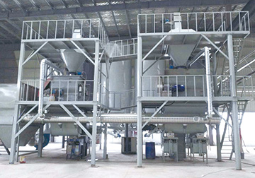砂漿生產(chǎn)線主要由原料儲(chǔ)存系統(tǒng)、配料稱(chēng)重系統(tǒng)、輸送系統(tǒng)、混合系統(tǒng)、氣相平衡系統(tǒng)、包裝系統(tǒng)及除塵系統(tǒng)構(gòu)成。主控制系統(tǒng)依據(jù)選定工藝配方下達(dá)生產(chǎn)指令,系統(tǒng)自動(dòng)從儲(chǔ)料倉(cāng)中按配比提取原料,原料經(jīng)配重后依次進(jìn)入待混倉(cāng)及無(wú)重力高效混合機(jī),實(shí)現(xiàn)快速混合作業(yè)。